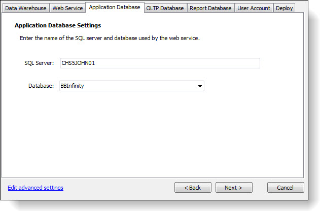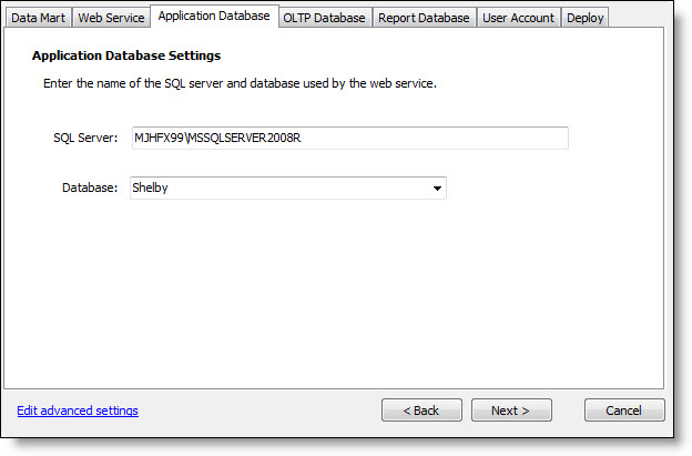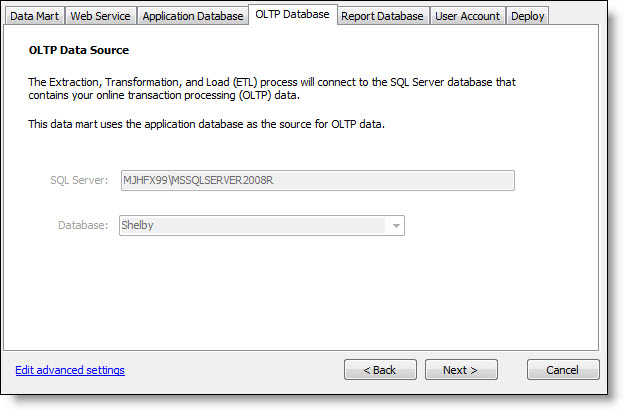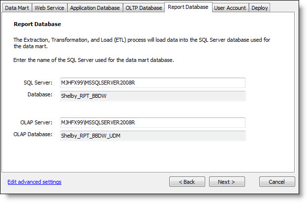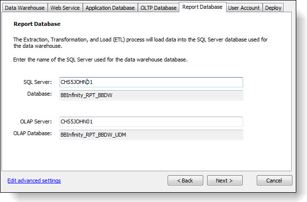 Note: If you set the Deploy OLAP cube setting to "False" under Deployment Options on the Edit Advanced Data Warehouse Setting screen, the OLAP Server and OLAP Database fields do not appear.