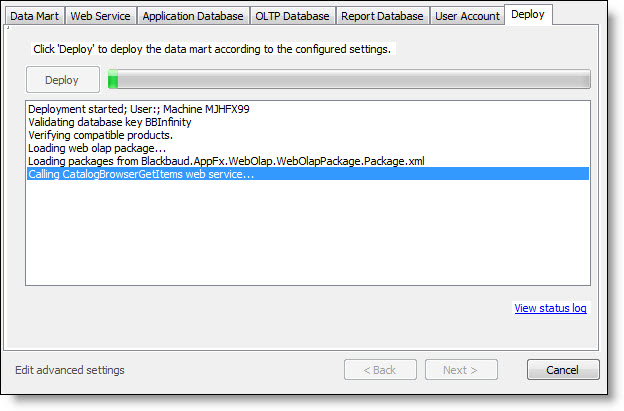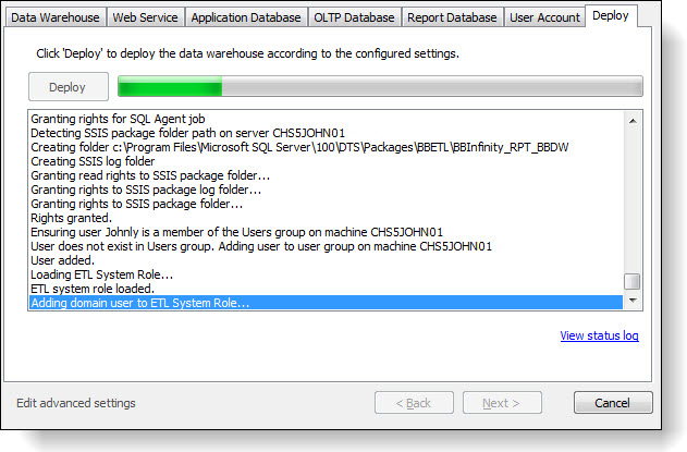 On the Deploy tab, click Deploy to deploy the data warehouse. The deployment begins, and a status log appears.