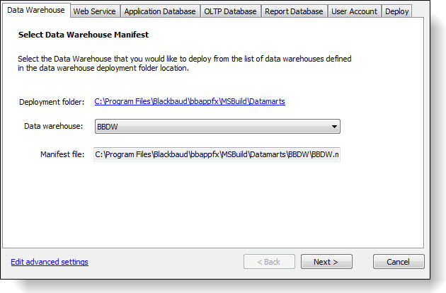 In the Manifest file field, the location of the manifest file appears. This XML file contains metadata about the data warehouse installation.