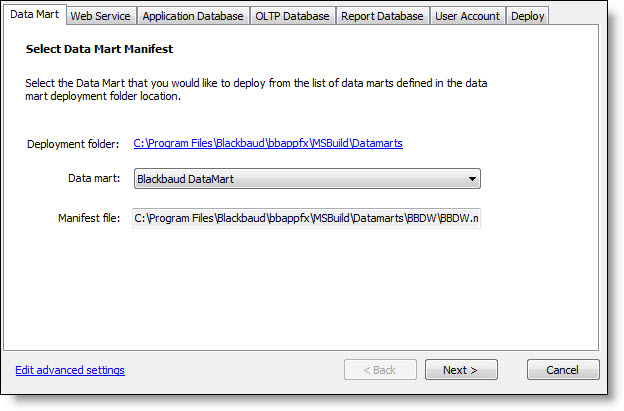 In the Deployment folder field, a link appears to the folder that the data warehouse deploys from. Make sure this points to the \bbappfx\MSBuild\Datamarts folder in your installation directory. If it does not, click the link and on the Browse For Folder screen, select the \bbappfx\MSBuild\Datamarts folder in your installation directory.