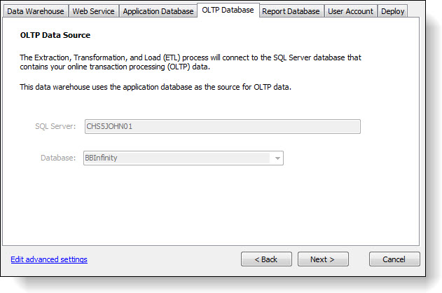 Note: You only enter data on the OLTP Database tab when you deploy the data warehouse for The Raiser's Edge. For Blackbaud CRM, the application database and the transactional database are the same, so the fields on this tab inherit their values from the corresponding fields on the Application Database tab.