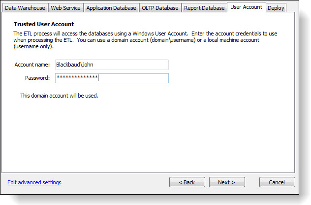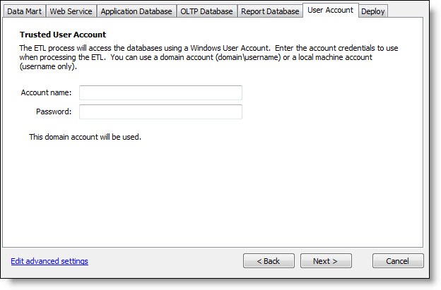 On the User Account tab, enter credentials for a Microsoft Windows user account that will access the application database and the data warehouse database and run the ETL process. You can enter a domain account or a local machine account.