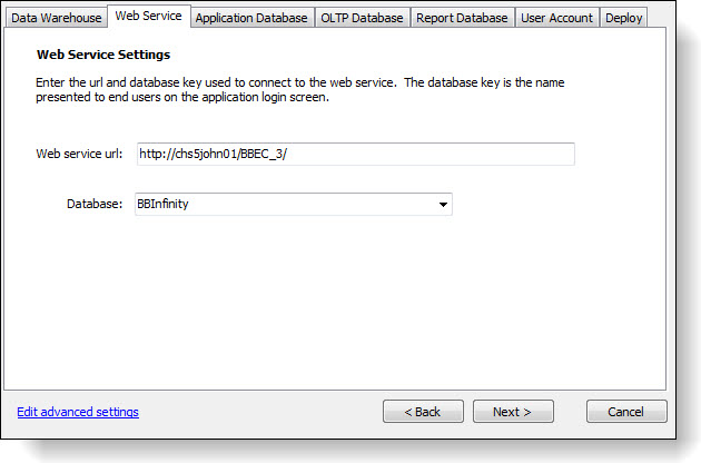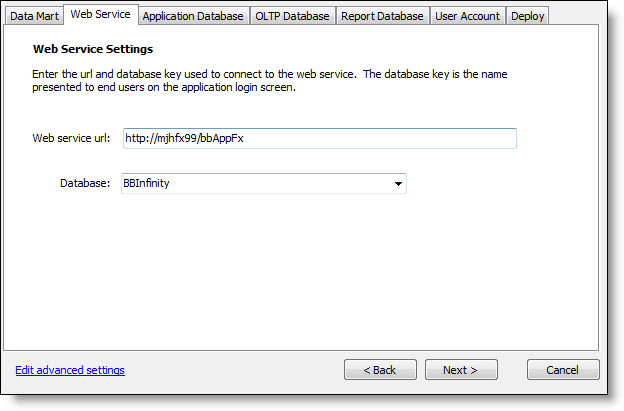 In the Web service url field, enter the URL for the application web server. This is the virtual directory for the web application. Generally, the format is “http://[Server name]/[Virtual directory name].”
