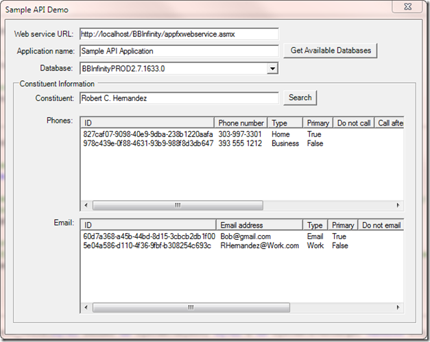 Search is called to retrieve a constituent, and a constituent ID is retrieved from the search results. LoadRecord is called with the constituent ID that uses the WebAPI to retrieve a data list and populate a list view on a win form.