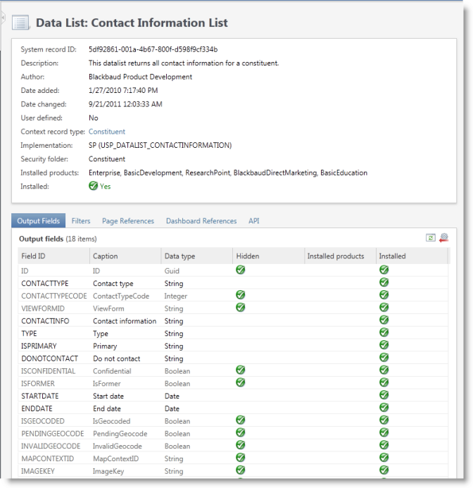 For example, if you use the Data list search task and search for the "Contact Information List," its Data List page displays the most relevant metadata about the list, including the ID, record type, implementation details, and whether the feature is installed. You can also see the output fields and filters, and view which pages and dashboards make use of this list (VERY handy!).