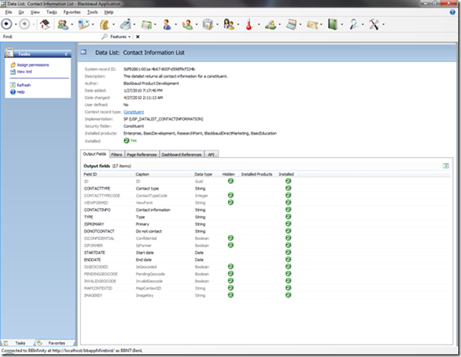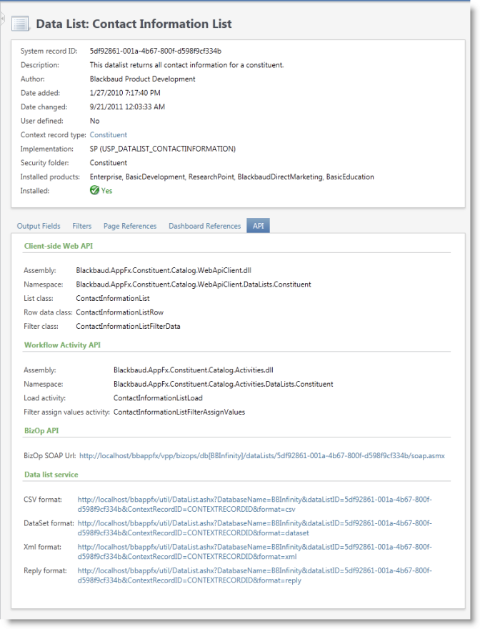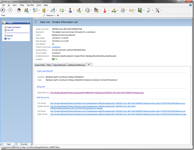 The API tab even provides a reference for developers on how to use this data list from a variety of APIs. If you’re writing .NET client-side code and want to set a reference to one of our Blackbaud.AppFx.*.WebAPIClient assemblies (which are now being created as part of the build!!) this tab shows you which assembly contains the wrapper for this feature. You can also see the SOAP and BizOp URLs to use to get the data returned by the data list. For more information on choosing the best Infinity Web Service to suit your needs, see Introduction to the Infinity Web Service APIs.