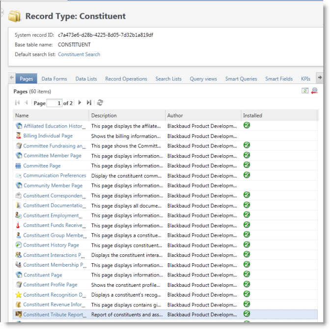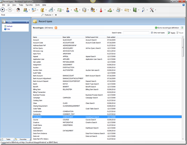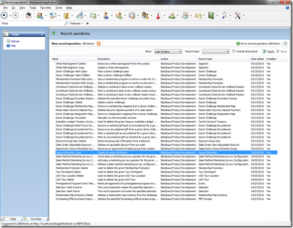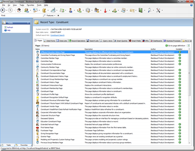 To help surf the sea of features in the system (approximately 20,000 specs at last count), Blackbaud has created a series of tasks located in an Application\Features folder in Administration. These tasks treat our platform idioms (data forms, data lists, pages, record operations, etc) just like any other first-class entity in the system (constituents, interactions, revenue, etc) and allow you to search for items and go to a page to see details about them. We even shine a spotlight on newly added features via the New features tasks.