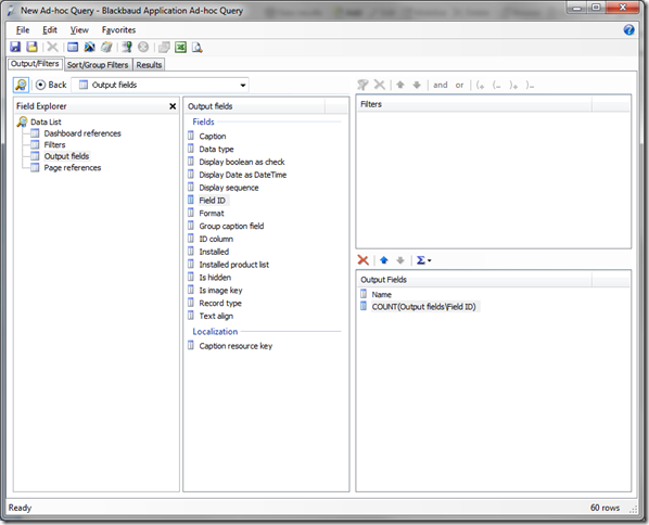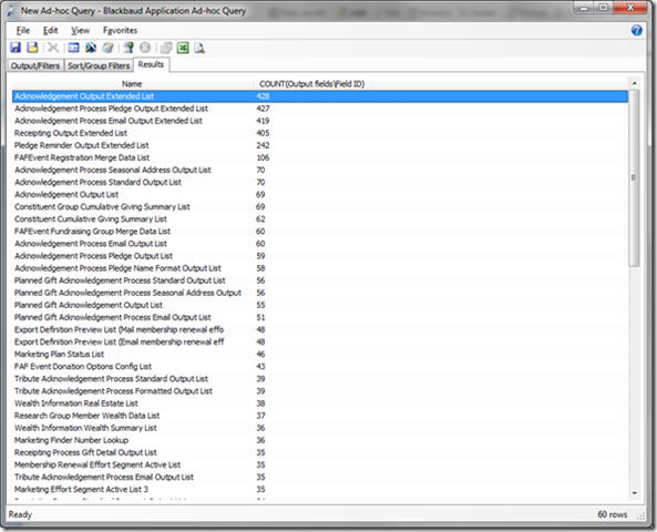 For example, want to know which data lists in the system have the most number of output fields? Use the Data List query and include the COUNT (OutputFields\ID) sorted by the count descending: