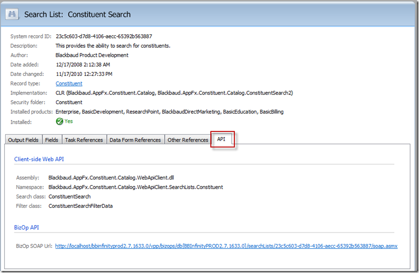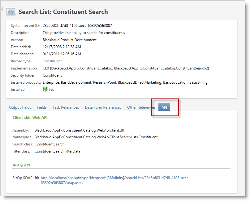 After the metadata page is open for your feature, you can click on the APItab to view the various APIs that you can utilize to automate the feature. Below we can see the two APIs that we can utilize to manipulate the Constituent Searchfeature: