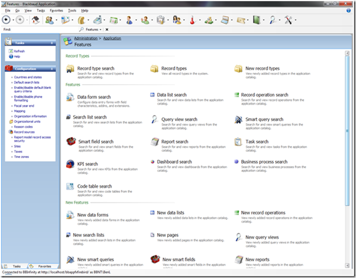Blackbaud CRM has the ability to navigate through the feature catalog and search for catalog items/features such as a data list or a data form. Within the Administration functional area you will find the Application\Features folder, which contains list of tasks that allow you to search for an item and go to pages to see details about that item. This feature is especially handy when attempting to access the security permissions for the feature, such as granting permission for a data form into a system role.