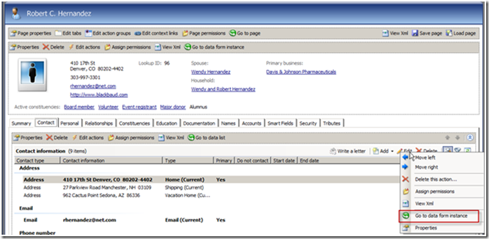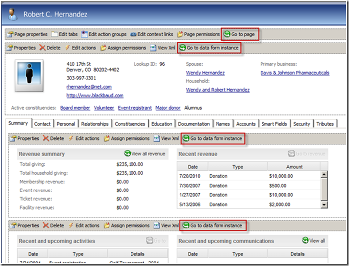 A very handy way to view the catalog information on a specific feature is to place the Infinity shell into Design Mode and look for a button or menu item prefixed with Go to associated with the feature. For example, on the Constituent page, select Go to page to navigate to the metadata for the page. Or select Go to data form instance above the summary view form to navigate to metadata for the data form.