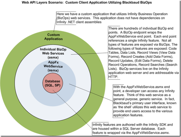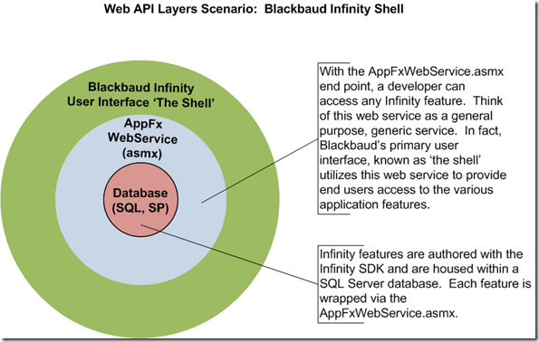 At a high level, the user interface "shell" that ships with all Infinity-based applications utilizes the Blackbaud AppFx Web Service (AppFxWebService.asmx) to communicate with Infinity-based features. "Features" refers to functionality created using the Infinity SDK such as data forms, data lists, record operations, etc. The AppFxWebService.asmx exposes every application feature including data lists, data forms, query, batch, security, KPIs, business operations and more.