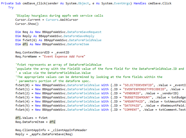 The AppFx Web Service is loosely typed and feature-centric. You use it to point to specific feature, issue a request, and retrieve the reply. The API does not consist of an object model. You won't find an AddExpense method on an Event business object. Instead, the DataFormSave method takes the system record ID or name of a feature that saves the event expense information. To save an event expense through the AppFx Web Service, you first have to search for the appropriate Add Data Form feature within the user interface. After you land on the metadata page for the feature, you can obtain the data form's system record ID or name. In the code sample below, this Add Data Form is named "Event Expense Add Form." In your code, you make a call to the AppFx Web Service's DataFormSave operation. One of the parameters in the request is the ID or name of the feature/Add Data Form. Below is a code snippet that leverages the web service to call the Event Expense Add Form feature to save an expense to a specific event.
