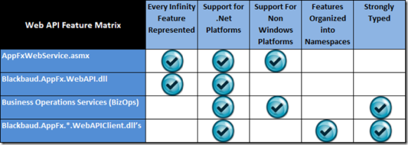 Blackbaud.AppFx.WebAPI.dll provides loosely typed access to any Infinity feature. If you use Visual Studio and .NET as your software development platform and you would prefer a single mechanism to communicate with the Blackbaud AppFx Web Service, then the Blackbaud.AppFx.WebAPI.dll may be your best bet. Just like the AppFxWebService.asmx, Blackbaud.AppFx.WebAPI.dll provides access to features beyond CRUDLS, meaning you can access features such as KPIs, business processes, batch, etc. You do not have to set a web reference to the web service within your project, you simply add a regular assembly reference to the Blackbaud.AppFx.WebAPI.dll within your project.