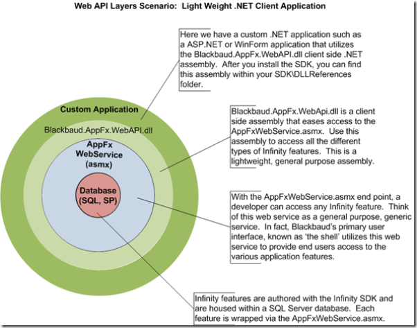In the diagram above, you can see that the Blackbaud.AppFx.WebAPI.dll (light green circle) is a client side DLL that wraps the Blackbaud AppFx Web Service (blue circle). It provides access to all types of features beyond CRUDLS.