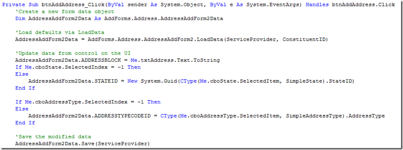 Calling an Add Data Form is pretty simple. Create new form data object, load data defaults into the data object, update the form fields on the data object with data from the UI, and the save the modified data.