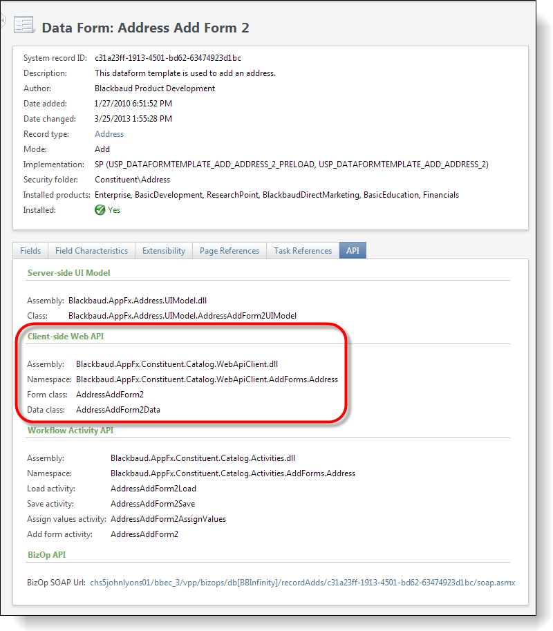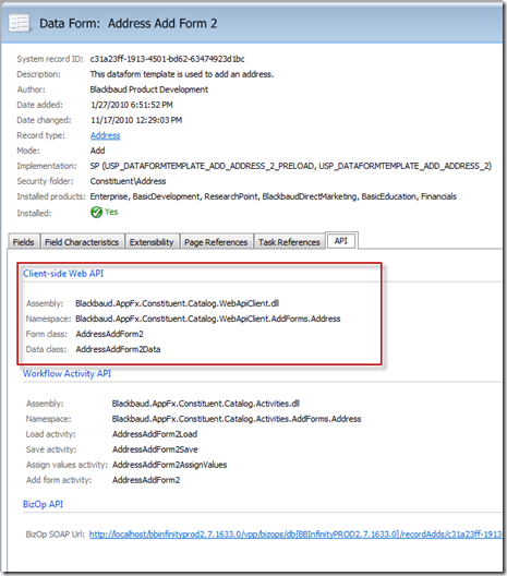 About two years after the introduction of the BizOps endpoints, the Blackbaud core platform team decided to create .NET client side assemblies that organize related features together. Blackbaud.AppFx.*.WebAPIClient.dlls contain strongly typed wrapper classes that make the web service calls automatically and make the platform's structure easy to navigate. These assemblies are included with the Infinity SDK and can be found by filtering your SDK\DLLReferences folder on Blackbaud.AppFx.*.WebAPIClient.dll. In my opinion, if you use the .NET platform to create an integration application that communicates with an Infinity application, this is the preferred API for its ease of use and minimal amount of code to get something accomplished. As a side note, the Blackbaud workflow activities that are used internally by Infinity Workflow use the WebAPIClient.dll classes. This reiterates the preference for the WebAPIClient.dlls as the preferred API for .NET code. Finally, as a matter of practicality, any feature that is not included within a WebApiClient.dll can be supplemented with a reference to the AppFxWebService.asmx or its cousin the Blackbaud.AppFx.WebAPI.dll.
