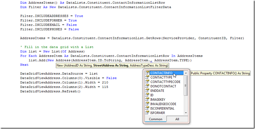 Each data list returns an enumerable list of strongly-typed objects, which makes for a very natural API. Use an array of data list rows to contain the rows returned from the call to the data list. Optionally, a filter object defines how to narrow down the rows. This example requires context with a record type of Constituent, so GetRows is called and the ConstituentID is passed for the context. The columns returned in the data list are strongly typed … nice.