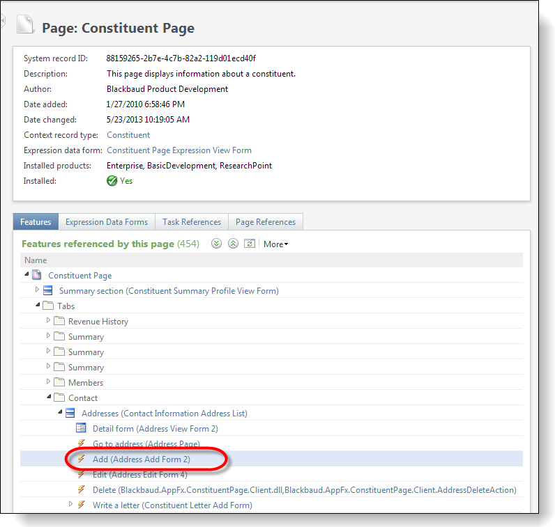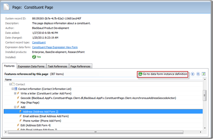 First, we need to find the feature that adds an address. Looking at the Constituent page in Design Mode, we can navigate to the page's metadata and find the feature that is utilized by the Add action within the Contacts tab on the page: Address Add Form 2. Clicking on the Go to data form instance definition button takes us to the metadata for the Address Add Form 2.