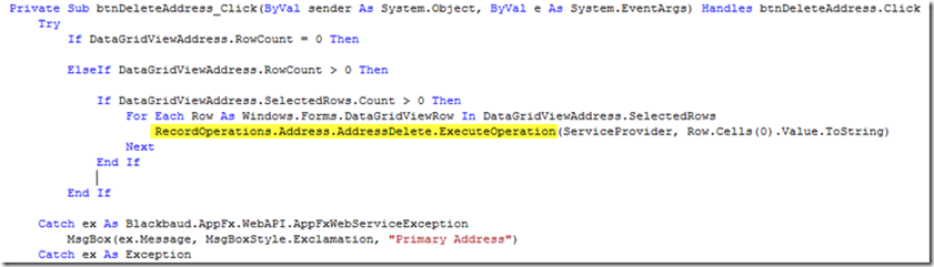 The API for record operations is very simple – each record operation maps to a single procedure call. The following code sample deletes an address from a datagridview.
