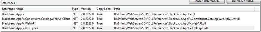 So, the new .NET Win Form project should have the following Blackbaud .NET assemblies referenced. Note, the path to the Blackbaud .NET assemblies depend on where you installed the Infinity SDK on your development machine.