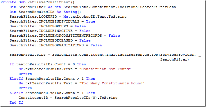 Using a search list is a matter of grabbing the appropriate filter data object from the WebAPIClient's SearchLists namespace. Below, you can see we use the IndividualSearchFilterData class from the Blackbaud.AppFx.Constituent.Catalog.WebApiClient.SearchLists.Constituent namespace. Next, we set values on the properties of the search filter. You can see we are providing a constituent lookup ID, and narrowing our results to only active individuals. The filter is passed to the GetIDs method. The results of the method call are placed into a string array. If the search was successful, then we extract the constituent ID from the results.