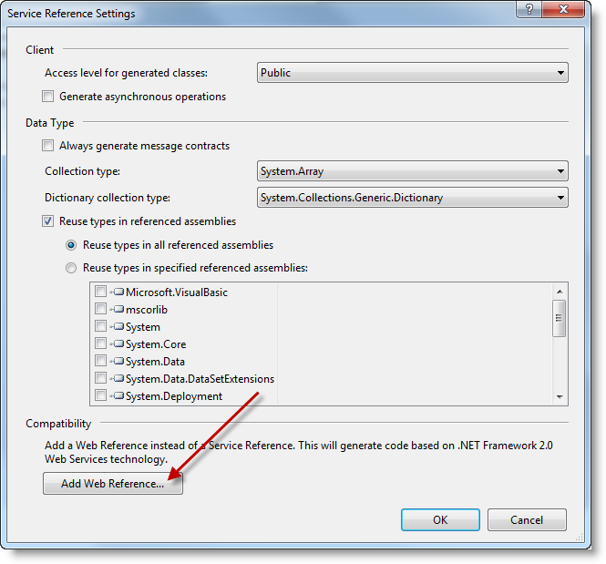The Service Reference Settings screen appears. Click Add Web Reference.