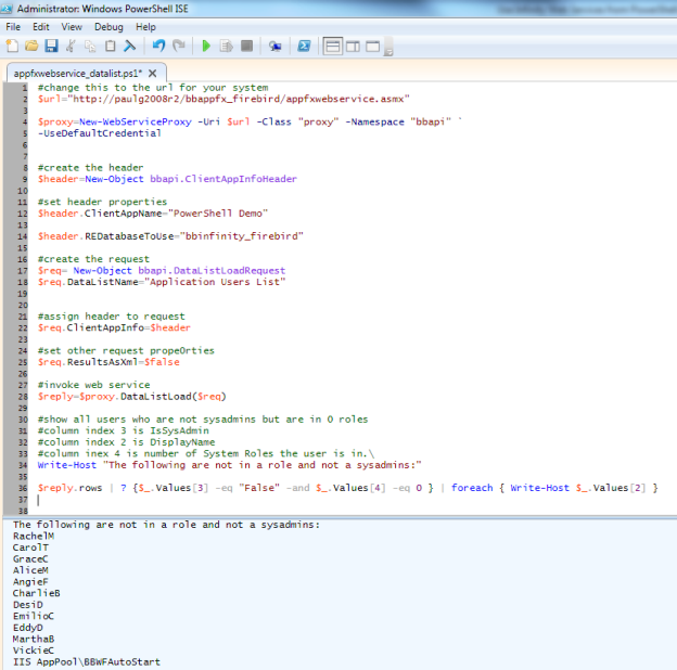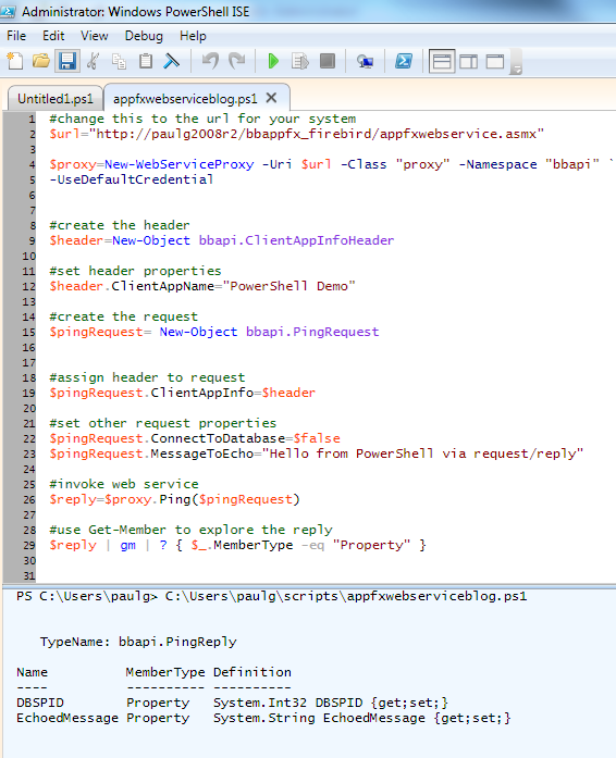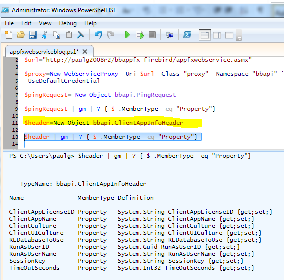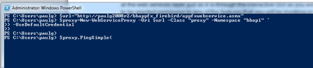 #change this to the url for your system $url="http://paulg2008r2/bbappfx_firebird/appfxwebservice.asmx" $proxy=New-WebServiceProxy -Uri $url -Class "proxy" -Namespace "bbapi" ` -UseDefaultCredential