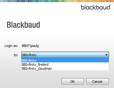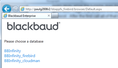 It is rare but possible that an Infinity endpoint could support multiple different databases from the same URL. This possibility is reflected in the API in the fact that almost every web service method requires you to pass in a unique key that identifies the intended target database. Note that the value of this key is not the physical SQL Server database name but rather a key/alias that looks up the actual SQL Server database name. On my system, I have three databases configured and thus I have three possible keys. I need to supply one to every web service API call I make if that method will touch a database. In the Web Shell UI on my system, I get prompted at login with a menu that presents all three keys:
