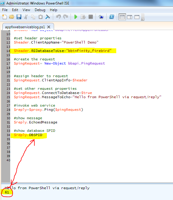 The most important properties are the ClientAppName and the REDatabaseToUse. For our first Ping invocation, we will ignore the REDatabaseToUse and just specify the ClientAppName. Then we will assign the header to the ClientAppInfo property of the PingRequest and set the other properties. The full script looks like this: