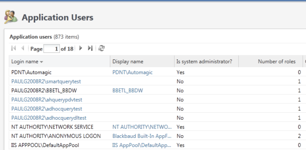 Now that we understand the basic pattern of how to call the Infinity web services, we can do something a little more useful than Ping. Suppose we want to find out if our database includes any users who are not system administrators but are also not in any system roles. Those users would not be able to do anything, so some cleanup is probably necessary on those records. We should either remove the users or place them into one or more system roles. In the Web Shell GUI, a page in the Administration\Security functional area lists all users.