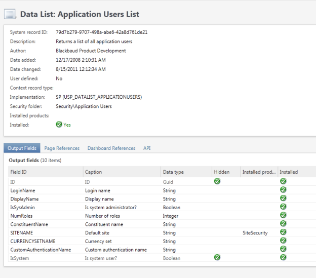 Figure: Metadata for the Application Users List