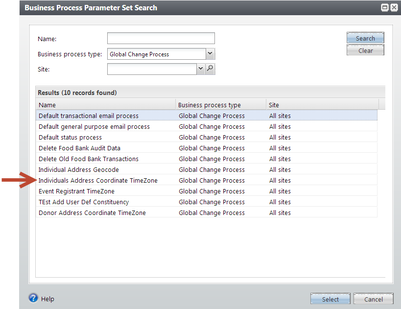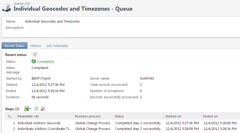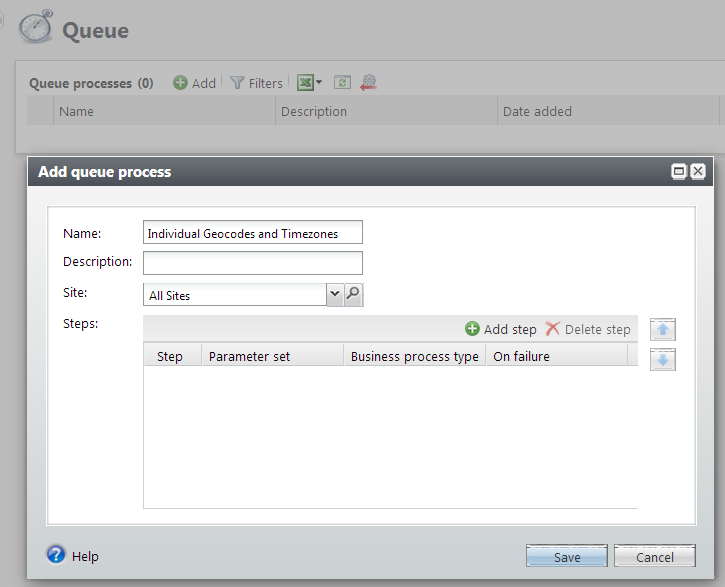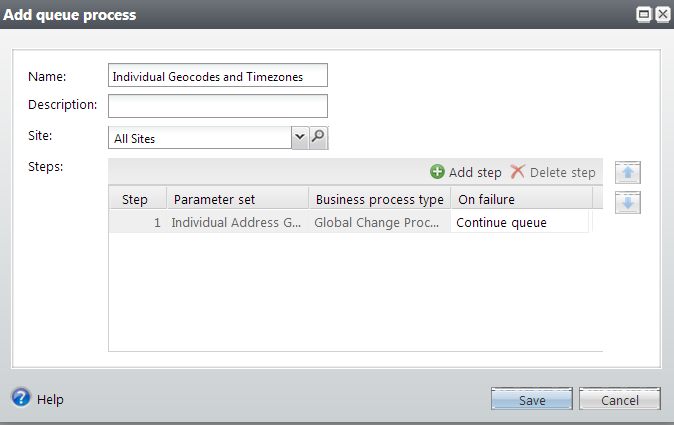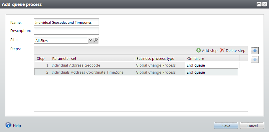 A Queue process enables a user to run a series of business process instances. The system uses an out of the box business process named "Global Change Process" to execute a global change instance. We will add a queue process that includes two steps. Each step executes a "Global Change Process." The first step executes an instance of the "Address Geocode" global change that adds Geocodes for a list of individual constituent addresses. The second step executes an instance of our "Address Coordinate TimeZone (Custom)" global change that processes time zone data for a list of individuals that have Geocode records for their addresses.