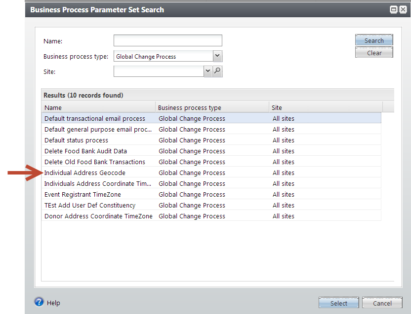 On the Add queue process screen, click Add step. The Business Process Parameter Set Search screen appears. Filter on a Business process type of "Global Change Process." Click Select to add the appropriate global change instance from the list of results.