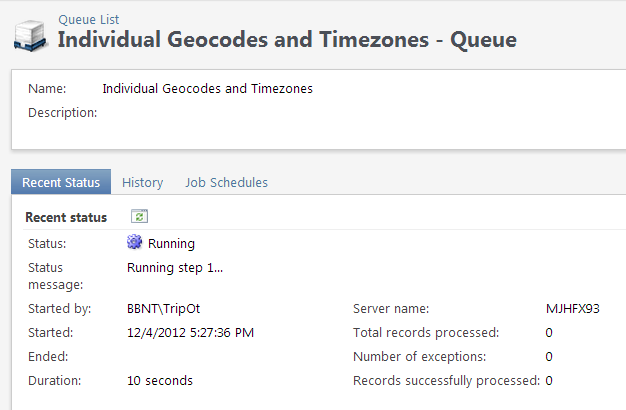 The queue begins. The queue process status page appears and displays results on the Recent status tab.This page contains the Recent status, History, and Job schedules tabs. When you run a queue process, the status page appears automatically. You can also view the status page without running the process.