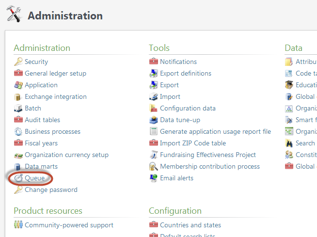 Queues are used to set up a series of business processes to run automatically and unattended. You can set up and run queues when you have large amounts of data to export, print, commit, import, send as email, or process with a global change. Because you create queues to work with large amounts of data, you can schedule the queue to run during a break in the day or when all your volunteers and employees have left for the day.