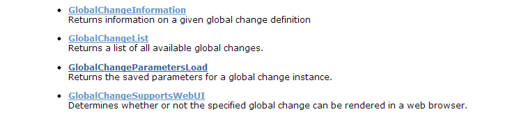 The Infinity platform is designed specifically to allow integration scenarios, and as part of that design, every application feature is accessible via standard web services accessible from any programming tool that utilizes XML, HTTP, and SOAP. Global Changes and other Infinity features can be accessed via a call to the primary web service API named AppFxWebService.asmx or one of the other programmatic wrappers.