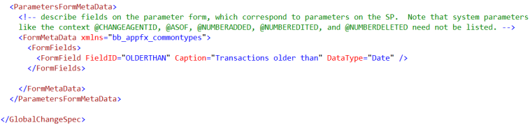With the spec file, let's replace the boiler plate form field parameters with a single date parameter for the user interface. We are going to modify the ParametersFormMetaData element 's FormMetaData child element by adding one form field. The form field will represent a user interface parameter. When the end user configures a new global change instance from a definition, the user will supply the values for the parameter using this form fields.