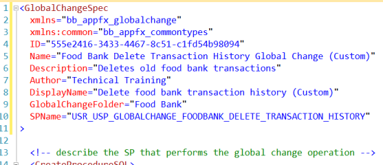 Open the FoodBankTX.DeleteHistory.GlobalChange.xml spec file and modify the GlobalChangeSpec element. We will modify the Name, Description, Author, DisplayName, GlobalChangeFolder, and SPName attributes to look something like this. Your ID attribute value will vary since the catalog item template defaults each new spec with a unique GUID value.