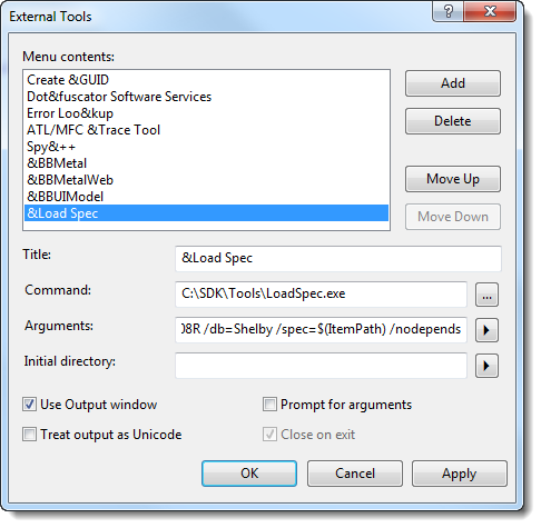 In the Title field, enter "&Load Spec." This determines how the menu item will appear in Tools.