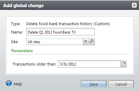 On the Add global change dialog window, you can provide a name, secure the global change by site, and provide parameter values. In the example below, I elected to delete transactions older than the specified date.