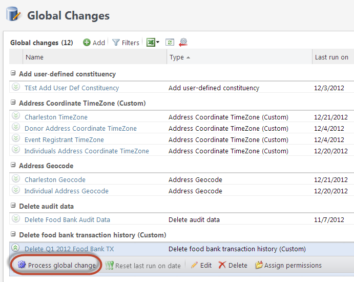 From here, you select the global change definition to use as the basis for your new global change instance. Select the Delete food bank transaction history (Custom) within the Food Bank folder.