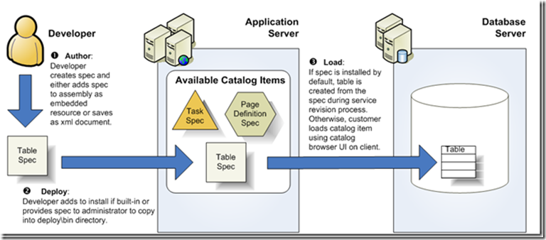 The answer is that at runtime, the metadata always comes from the database. While the best practice for third-party developers is to embed the custom XML specs into catalog assemblies that get deployed to the web server and then load the spec into the database via the catalog browser, the fact is that at runtime the system is only going to look in the database when it needs the spec metadata. The Blackbaud Product Development teams actually no longer embed the XML files in our assemblies in the latest versions of Blackbaud CRM (2.9 2011 Q3 or later). This is why if you go to the Catalog Browser page in Administration\Application in the shell in the most recent release, you will not see much in any Blackbaud.AppFx.*.dll assemblies.