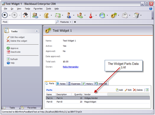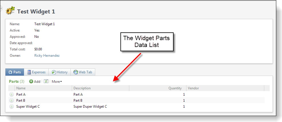 Figure: The widget Parts data list user interface