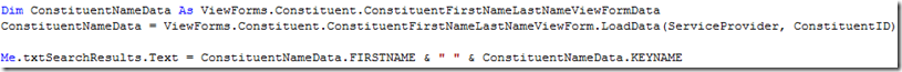 Calling a View Data Form is very simple. First grab the strongly typed form data object, such as ViewForms.Constituent.ConstituentFirstNameLastNameViewFormData in the code sample below. Next, LoadData is called to retrieve the form's data. After form field data is retrieved, you can view it using strongly typed properties of the form data, such as FIRSTNAME and KEYNAME below.