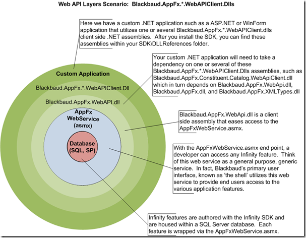 About two years after the introduction of the BizOps endpoints, the Blackbaud core platform team decided to create .NET client side assemblies that organize related features together. Blackbaud.AppFx.*.WebAPIClient.dlls contain strongly typed wrapper classes that make the web service calls automatically and make the platform's structure easy to navigate. These assemblies are included with the Infinity SDK and can be found by filtering your SDK\DLLReferences folder on Blackbaud.AppFx.*.WebAPIClient.dll. In my opinion, if you use the .NET platform to create an integration application that communicates with an Infinity application, this is the preferred API for its ease of use and minimal amount of code to get something accomplished. As a side note, the Blackbaud workflow activities that are used internally by Infinity Workflow use the WebAPIClient.dll classes. This reiterates the preference for the WebAPIClient.dlls as the preferred API for .NET code. Finally, as a matter of practicality, any feature that is not included within a WebApiClient.dll can be supplemented with a reference to the AppFxWebService.asmx or its cousin the Blackbaud.AppFx.WebAPI.dll.