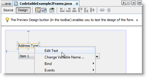 public CodeTableExampleJFrame() { initComponents(); _clientAppInfoHeader.setREDatabaseToUse("BBInfinity"); req.setCodeTableName("ADDRESSTYPECODE"); req.setClientAppInfo(_clientAppInfoHeader); reply = _appFxWebService.getAppFxWebServiceSoap12().codeTableEntryGetList(req); jComboBoxAddressType.removeAllItems(); for (int i = 0; i < reply.getRows().getR().size(); i++){ jComboBoxAddressType.addItem(reply.getRows().getR().get(i).getCode()); } -