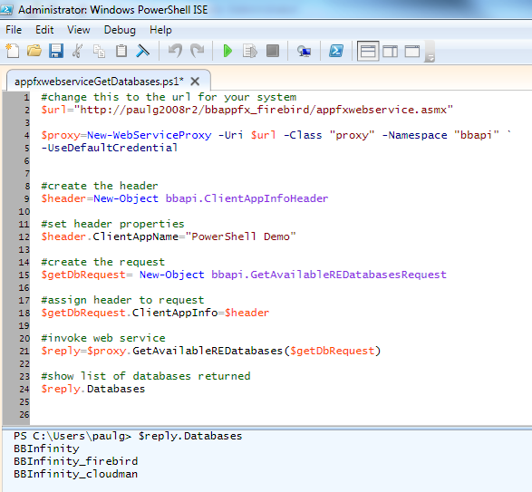 #change this to the url for your system $url="http://paulg2008r2/bbappfx_firebird/appfxwebservice.asmx" $proxy=New-WebServiceProxy -Uri $url -Class "proxy" -Namespace "bbapi" ` -UseDefaultCredential