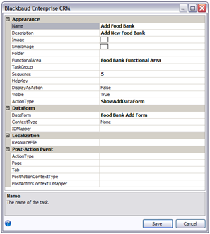 After you click the Add action, a properties dialog window appears. Enter the following values for the Name, Description, Functional Area, ActionType, and DataForm properties.