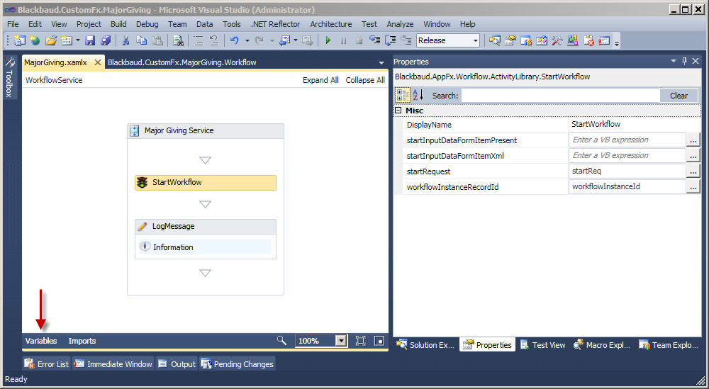 Open the MajorGiving.xamlx within the workflow designer and select the Variables button/tab at the bottom of the designer.